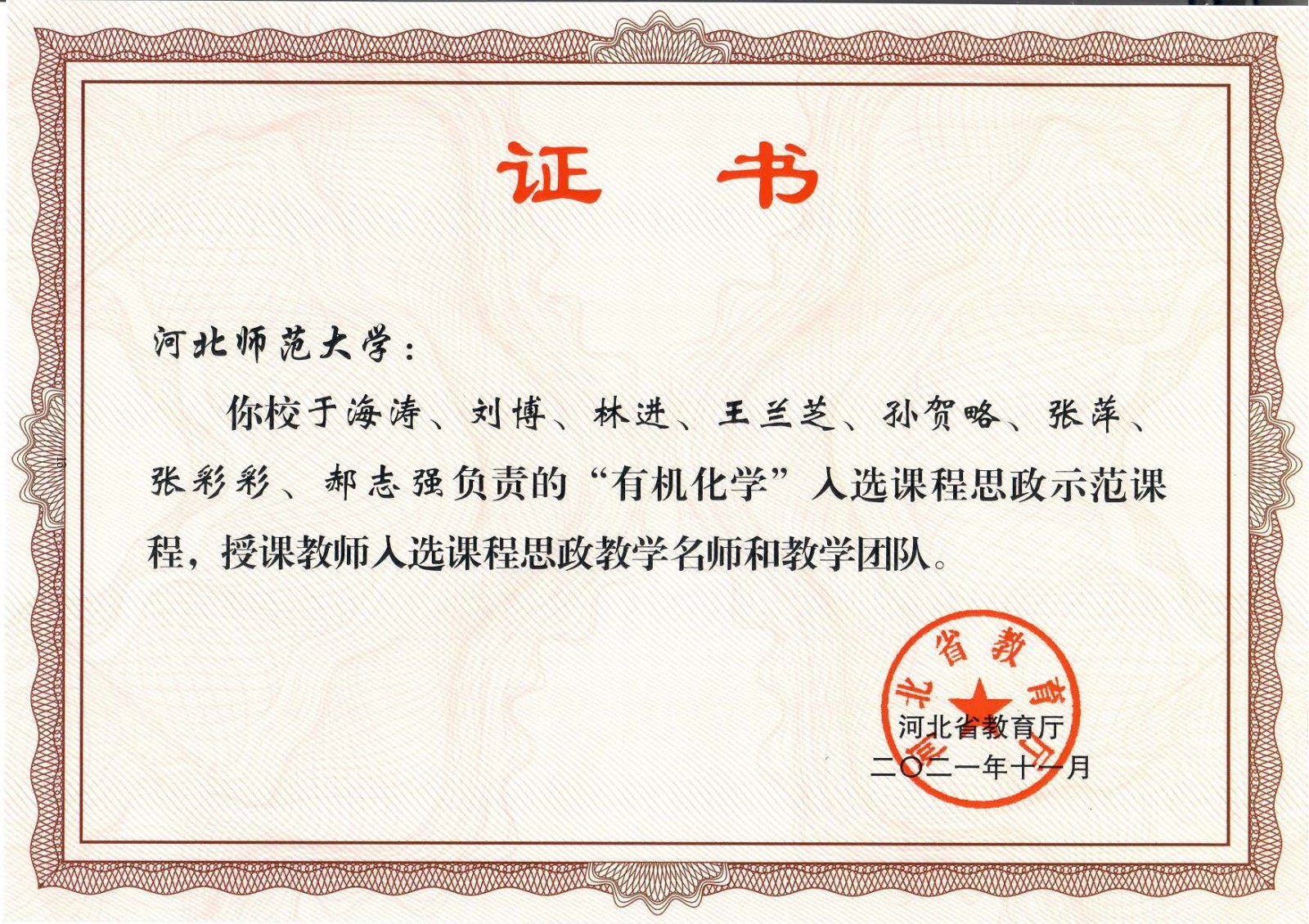 EBpay官网 于海涛教授团队负责的“有机化学”入选河北省课程思政师范课程